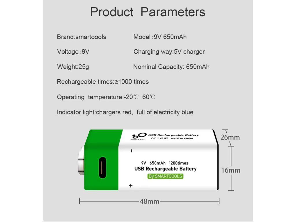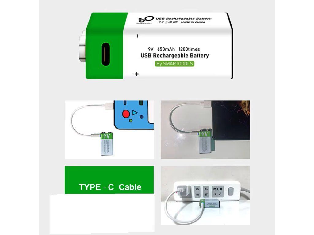 Dobíjecí Li-ion baterie 9V 650mAh USB-C Smartools – sada 2 ks + kabel + USB-C kabel