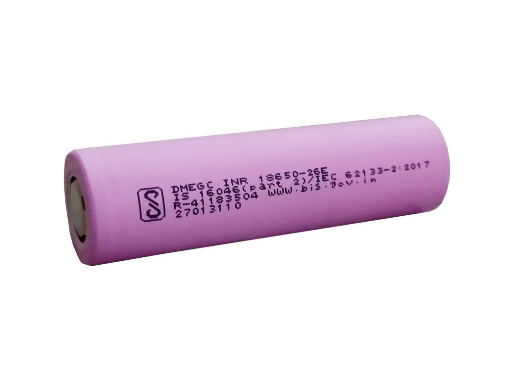 Kvalitní Li-ion článek velikosti 18650 výrobce DMEGC INR18650-26E s kapacitou 9,36Wh/2600mAh a vybíjecím proudem 8A, IR<20mΩ, 1000 nabíjecích cyklů