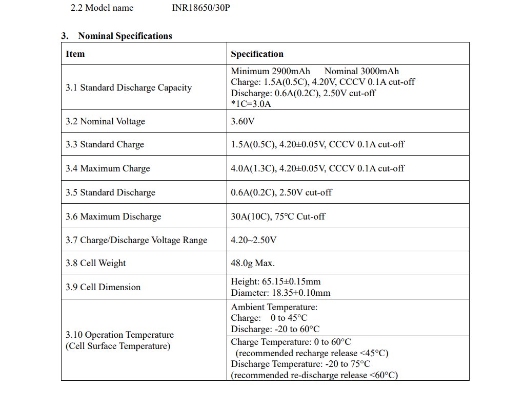 | Model: INR18650/30P: | Výrobce: EVE Energy Co., Ltd. |