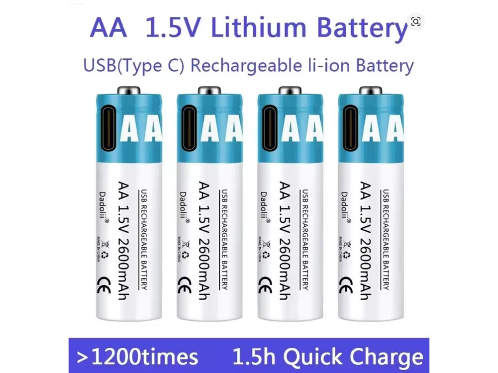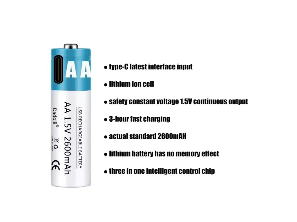 Moderní AA Li-Ion nabíjecí baterie s vysokou kapacitou 2600 mAh a stabilním výstupním napětím 1,5 V je ideální náhradou za jednorázové alkalické baterie. Nabíjení probíhá pohodlně přes USB-C (5 V) a plné nabití trvá přibližně 1,5 hodiny.
