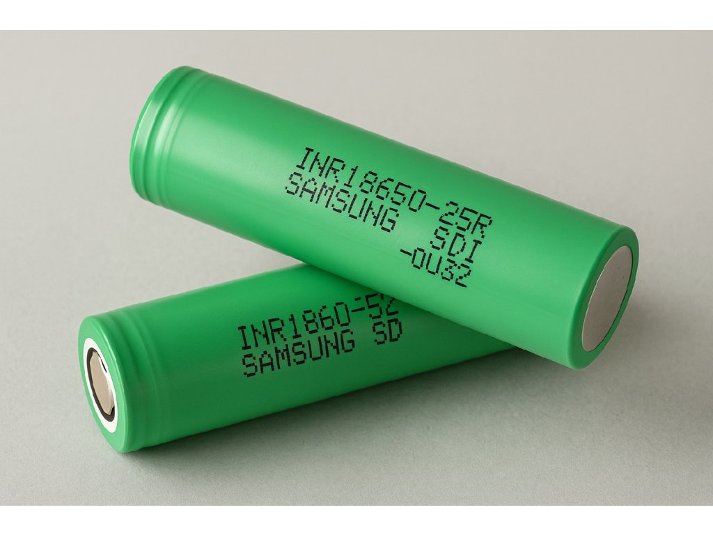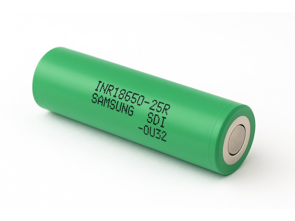 Originální článek Samsung INR18650-25R s kapacitou 2500 mAh a trvalým vybíjecím proudem až 20 A. Vhodný pro sestavy bateriových packů a aplikace s vyšším odběrem. Zelený plášť, jasné označení výrobce a série.