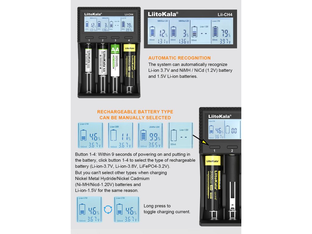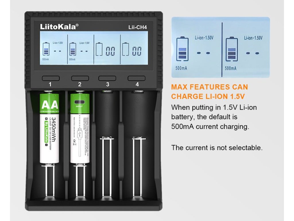 Lii-CH4 je moderní čtyřslotová inteligentní nabíječka určená pro široké spektrum dobíjecích baterií. Díky nezávislému řízení každého slotu a mikroprocesorovému řízení zajišťuje bezpečné, rychlé a šetrné nabíjení. Vyniká také podporou 1,5V Li-ion baterií, které běžné nabíječky často nepodporují.