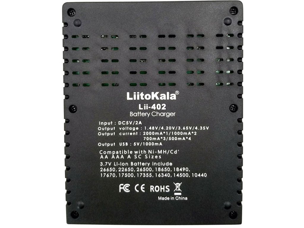 Liitokala Lii-402 je kvalitní, univerzální, plně automatická a inteligentní čtyřslotová nabíječka. Je vhodná k dobíjení článků typu Li-ion, Li-pol, Ni-Cd a Ni-MH (nabíječka sama rozpozná, jaký typ článku jste do ní vložili a podle toho přizpůsobí režim nabíjení). Jen pro nabíjení baterií typu Li-Fe a Li-ion 3.85V je třeba zvolit režim manuálně. Je možné souběžně nabíjet baterie různých formátů A/AA/AAA/18650/20700/21700/26650/22650, protože každý kanál funguje nezávisle. Má ochrany proti přebití, podvybití, proti zkratu a proti špatnému vložení baterie.